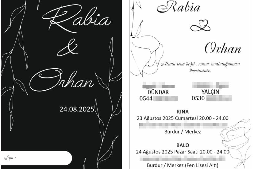 Burdur'da iddiaya göre; kamyonun sıkıştırması sonucu hakimiyetini kaybettiği otomobil ile aydınlatma direğine çarparak yaralanan Orhan Yalçın'ın, kazada hayatını kaybeden eşi Rabia ile 6 ay önceki düğün davetiyesinde yer alan sözler, yürek burktu. Geçen 15 Ağustos'ta nikah, 23 Ağustos'ta kına ve 24 Ağustos'ta düğün yaparak dünyaevine giren Yalçın çifti, kalp baskılı davetiyesinde 'Mutlu sona değil, sonsuz mutluluğumuza davetlisiniz' sözleri ile yakınlarını düğüne davet ettikleri görüldü.