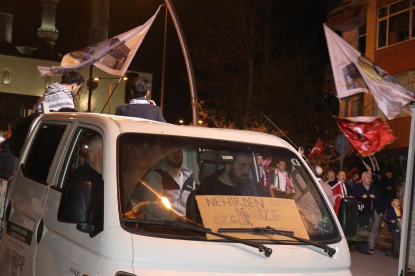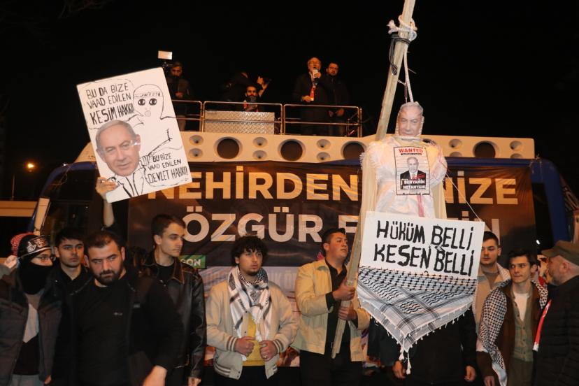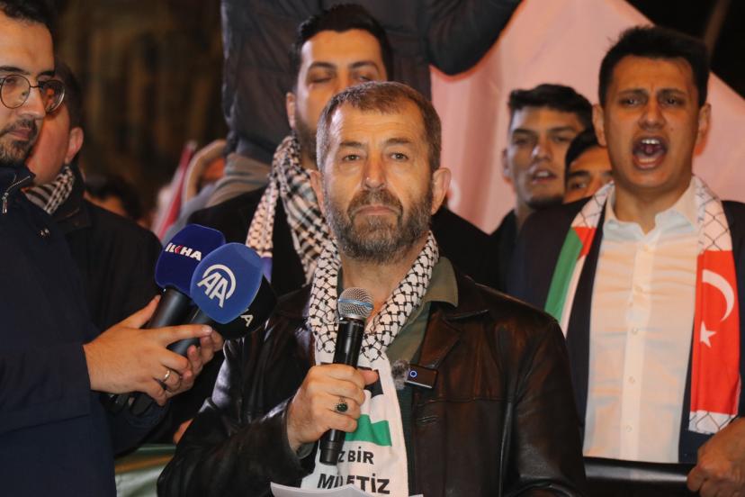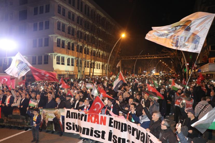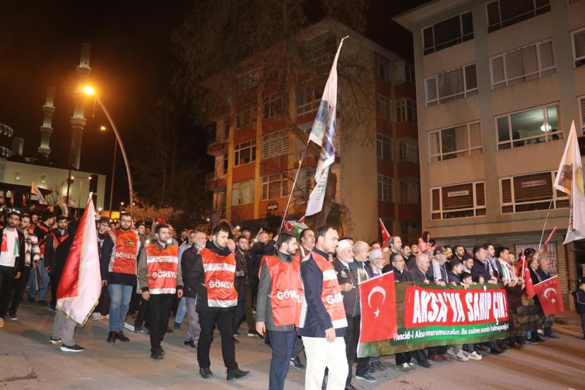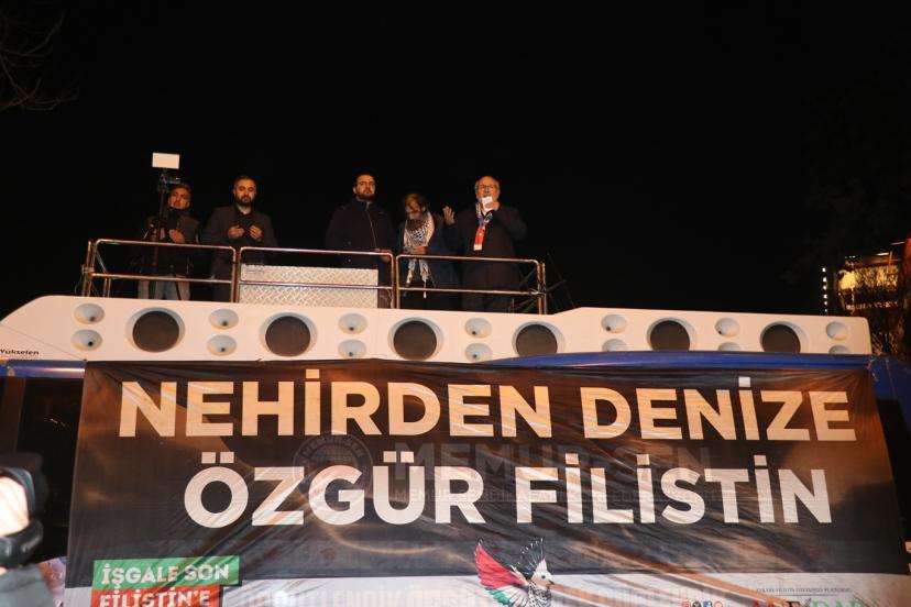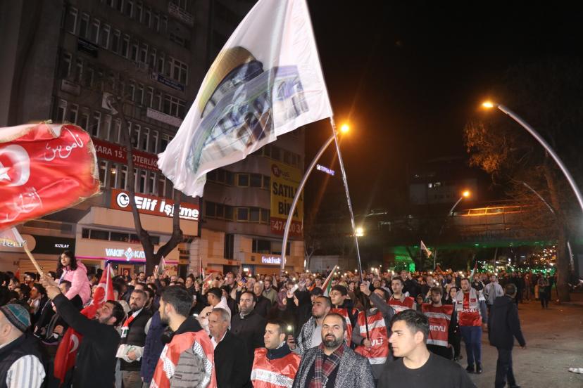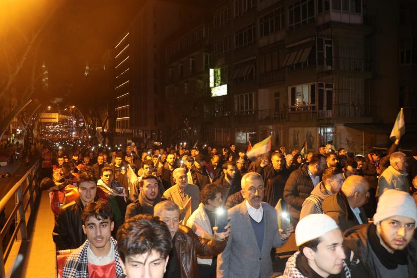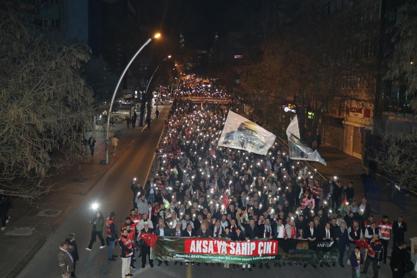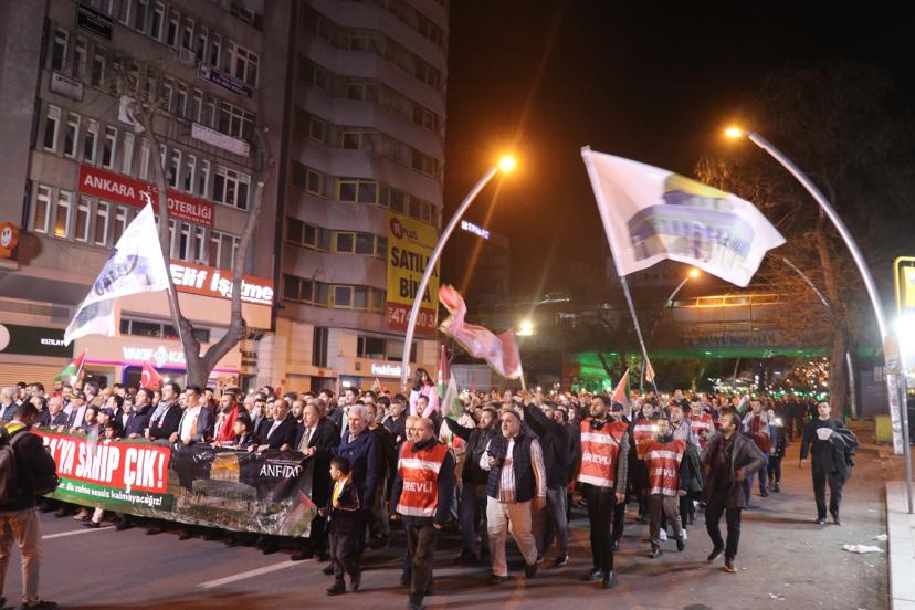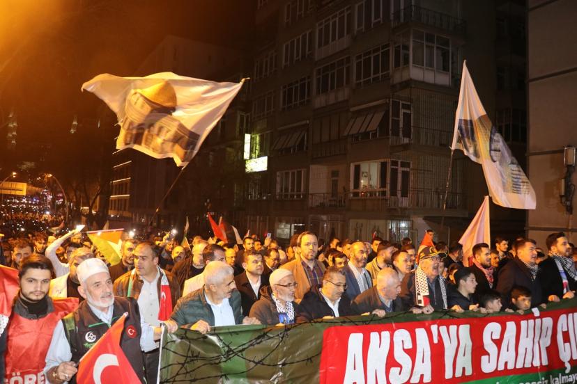 Yürüyüş boyunca katılımcılar, “Ankara’dan Kudüs’e, Filistin’e bin selam”, “Mescid-i Aksa onurumuzdur”, “Katil israil, katil ABD”, “Aksa Tufanı siyonizmi yenecek”, “Siyonist katiller hesap verecek”, “Oluk oluk kan aksa, kurtulacak El Aksa” ve “Mescid-i Aksa, müminleri bekliyor” sloganları atarak Filistin’e desteklerini dile getirdi.