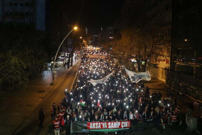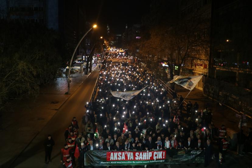 İşgal ve Mescid-i Aksa’nın ibadete kapatılmasına tepki göstermek amacıyla Ankara’da protesto yürüyüşü düzenlendi. Ankara Filistin Dayanışma Platformu (ANFİDAP) tarafından organize edilen yürüyüş, Kocatepe Camii önünden başlayarak Sıhhiye Meydanı’nda sona erdi. Yoğun katılımın olduğu yürüyüşte, Kudüs aşığı on binler Filistin’e destek sloganları attı.