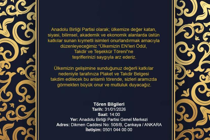 ABP kaynakları, ödül törenine ilişkin kapsam ve uygulama detaylarının ilerleyen süreçte kamuoyuyla paylaşılacağını bildirdi. Parti yönetimi, organizasyonun ana ekseninin “Türkiye’ye katma değer” anlayışı olduğunu ve bu anlayışın farklı alanlarda üretilen faydayı görünür kılma hedefiyle sürdürüleceğini vurguladı.