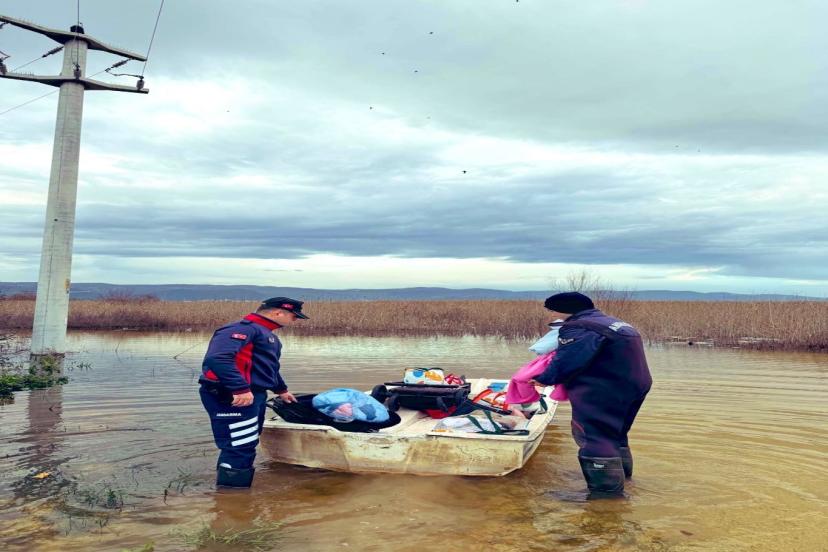 İhbar üzerine bölgeye sevk edilen Jandarma Asayiş Bot Komutanlığı ekipleri, suyla çevrili eve ulaşarak aileyi güvenli şekilde tahliye etti.