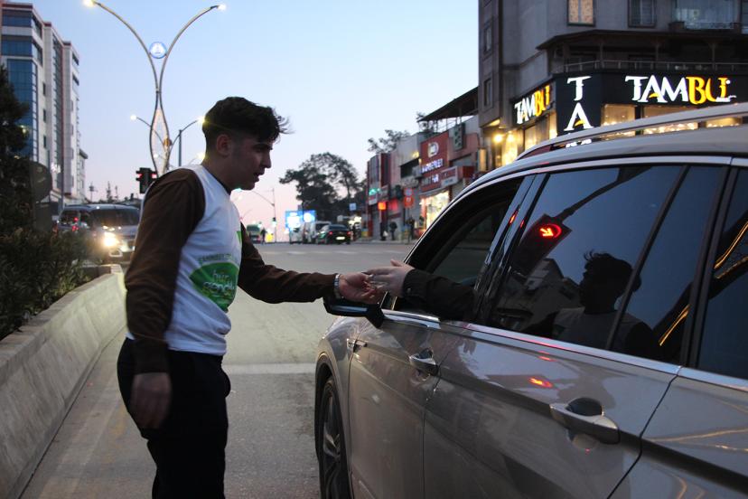 Şehrin en yoğun kavşak ve ışık noktalarında araçların yanına giderek sürücülere ve yolculara hurma ile su ikram eden gençler, kısa sürede çok sayıda kişiye ulaştı.