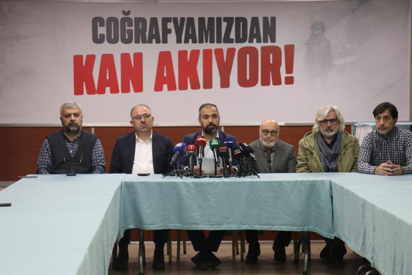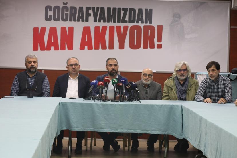 İHH Genel Merkezi'nde, "Coğrafyamızdan Kan Akıyor" başlığıyla gerçekleştirilen basın toplantısına, yaklaşık 20 sivil toplum kuruluşu temsilcisi katılım sağladı.