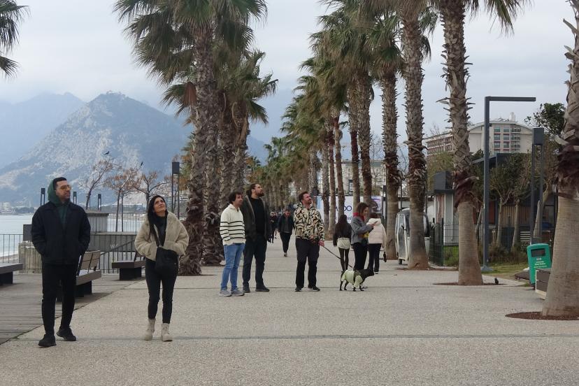 Antalya'da hava çok bulutlu ve yer yer yağışlı seyrederken gün içinde sıcaklık 17 dereceye kadar yükseldi. Nem oranın yüzde 80'e ulaştığı kentte, rüzgar ise zaman zaman etkili oldu. Kapalı havaya rağmen Konyaaltı Sahili'nde yürüyüşe çıkan yerli ve yabancı turistler, baharın müjdecisi olarak bilinen leylekle karşılaştı. Etrafında birkaç kuşla birlikte sahil üzerinden süzülen leylek, bir süre havada daire çizdikten sonra gözden kayboldu. Leyleği fark eden vatandaşlar gözlerini gökyüzüne çevirerek o anları izledi, bazıları ise cep telefonlarıyla görüntü almaya çalıştı.