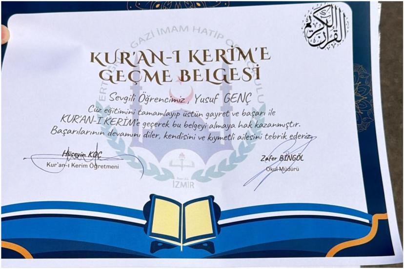 İzmir’in Bayraklı ilçesindeki Ertuğrul Gazi İmam Hatip Ortaokulu’nda Kur’an-ı Kerim’e geçiş programı düzenlendi. Programda Kur’an okumaya geçen öğrencilere Kur’an-ı Kerim hediye edildi.