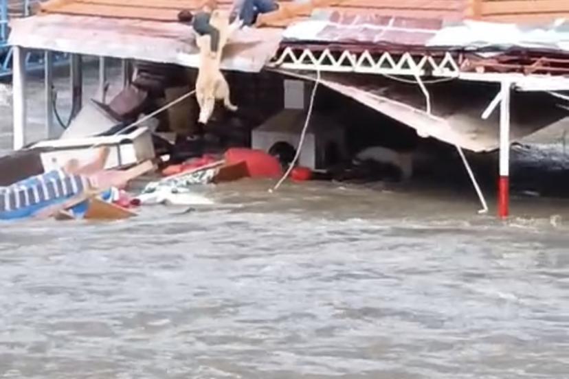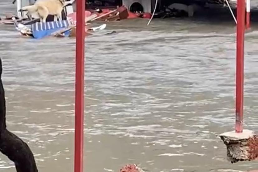 ANTALYA’nın Alanya ilçesinde debisi yükselen çaydaki taşkında mahsur kalan 'Paşa' isimli köpeği çardak çatısına çekerek, suda...