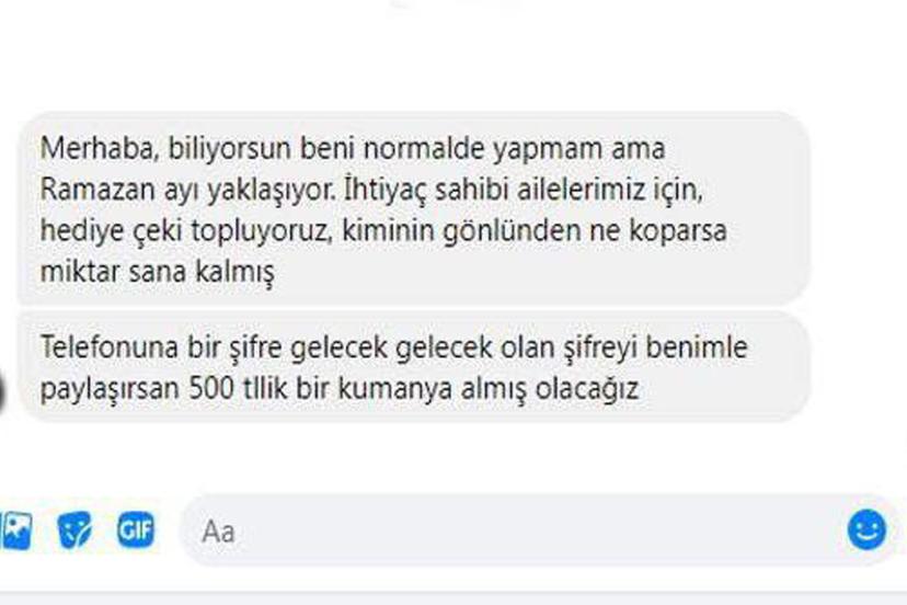 Dolandırıcıların bir diğer yönteminin ramazan yardımı ve hediye çeki vaadi olduğunu belirten Prof. Dr. Kırık, popüler e-ticaret siteleri ve zincir marketlerin isimlerinin kullanıldığını kaydederek, "Önce bir arkadaşınızın sosyal medya hesabını ele geçiriyorlar. Ardından sizinle iletişime geçerek, ramazana özel 5 bin lira hediye çeki kazandığınızı söylüyorlar. Amaç, sizi ücretli bir mobil servise abone yapmak. Hem paranızdan hem de kişisel verilerinizden oluyorsunuz" dedi. Ramazana özel devlet desteği verildiği yönünde mesajlar gönderildiğini de aktaran Prof. Dr. Kırık, "Sizi arayüzü birebir kopyalanmış sahte bir e-Devlet sitesine yönlendiriyorlar. T.C. kimlik numaranız ve şifreniz ele geçiriliyor. Daha sonra adınıza dolandırıcılık işlemleri yapılabiliyor. Bu çok ciddi bir risk" diye konuştu.