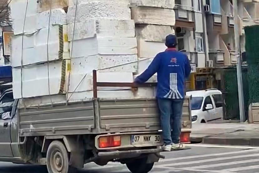 ANTALYA'nın Alanya ilçesinde inşaat malzemesi yüklü kamyonetin kasasından tutunarak yolculuk yapan kişi, diğer sürücüler tarafından cep telefonuyla kaydedildi. Görüntülerin sanal medyada paylaşılması üzerine araç plakasına 3 bin lira cezai işlem uyguladı.