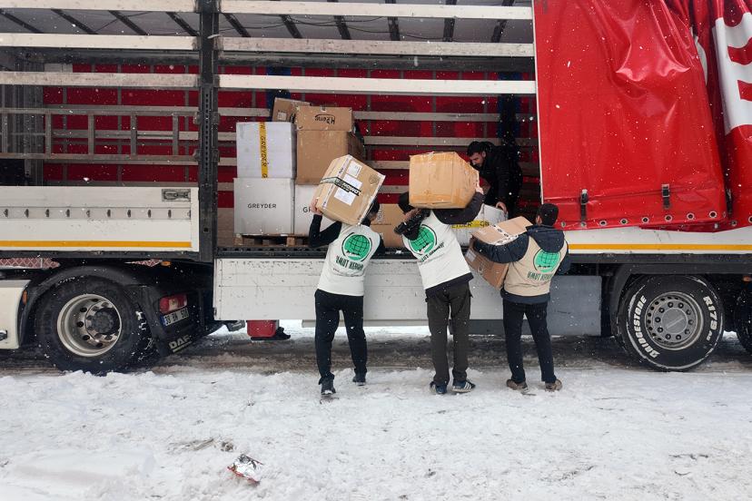 Suriye’deki ihtiyaç sahiplerinin mağduriyetini gidermek amacıyla başlatılan insani yardım seferberliği kapsamında; gıda, giyim, ayakkabı, bebek bezi ve bebek maması gibi temel ihtiyaç malzemeleri gönüllülerin yoğun mesaisiyle tıra yüklendi.
