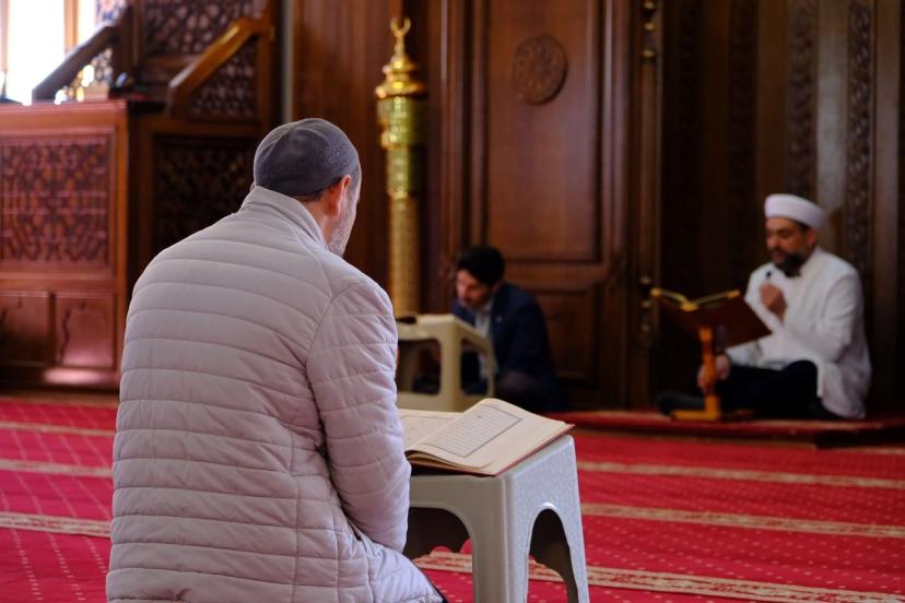 Kılınan öğle namazının ardından mukabele halkaları oluşturan vatandaşlar, Kur'an-ı Kerim'i huşu içerisinde okuyor. İmam ve hafızlar Kur'an-ı Kerim'i sesli olarak okurken, mukabeleye katılan vatandaşlar da okunan ayetleri takip ediyor.