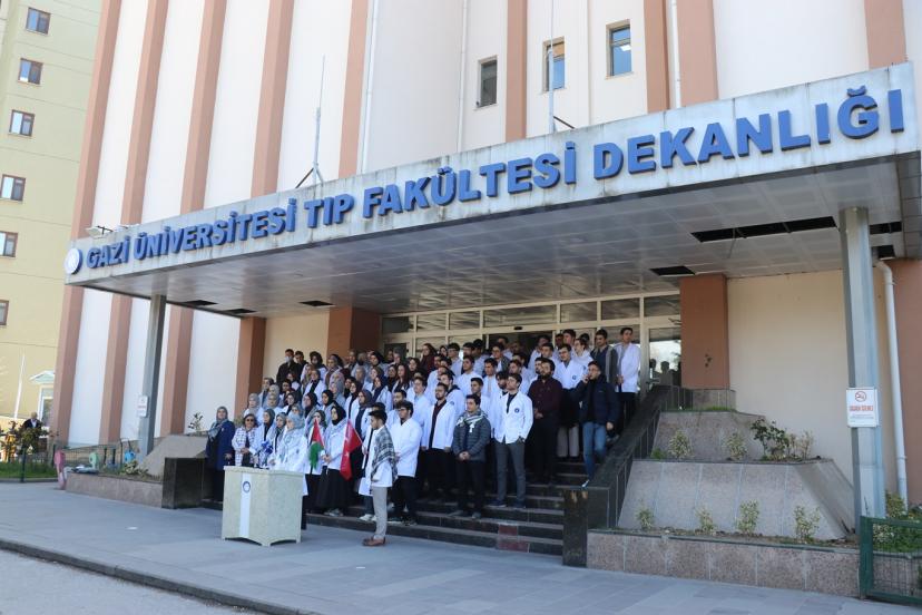 İnsan hayatını korumayı en kutsal görev olarak gören hekimler ve hekim adayları, Filistinli esirlere yönelik idam yasasına ve devam eden saldırılara karşı Gazi Üniversitesi Tıp Fakültesi Dekanlık binası önünde bir araya geldi. Sağlık çalışanları, 'yaşatmak' ilkesine vurgu yaparak insanlığın infazına karşı ortak bir duruş sergiledi.