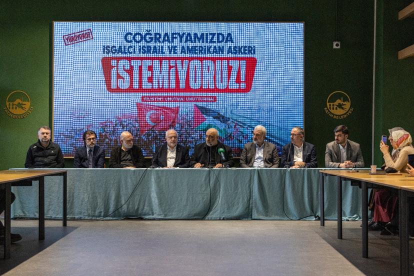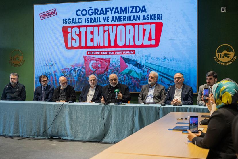 basın toplantısında bir konuşma yapan Filistin'e Destek Platformu Başkanı Osman Nuri Kabaktepe, "Siyonist rejimin Amerika ile birlikte İran'a ve bölgemize yönelik saldırılarının hem karşısında olduğumuzu hem de bölgemizi işgal etmeye yönelik çabalarının sadece bölgeye değil, dünyaya da istikrarsızlık getirdiğini, bu yapılanlara hayır dediğimizi ve durduğumuz yerin belli olması adına pazar günü hep beraber gördüğümüzü, körleşmediğimizi, duyduğumuzu, sağırlaşmadığımızı göstermek için tüm İstanbullu kardeşlerimizi yürüyüşümüze davet ediyoruz." şeklinde konuştu.