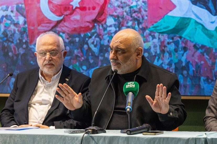 Basın toplantısında söz alan İHH Genel Başkanı Av. Bülent Yıldırım, "Bedeli ağır ama zaferi lezzetli olan dönemlere yaklaştık. Görünen o ki Amerika'da, Avrupa'da, dünyada siyonizmden kurtulacak. Ve kurtulması lazım. Bu nedenle halkların yorgunluktan vazgeçmesi lazım. Amerika ile İsrail geliyor, İran'da kız çocuklarının okulunu bombalıyor, yorgunluk duymuyor. Bizim insanlarımızda eğer meydana çıkma konusunda bir tembellik varsa, bunun vebali çok büyüktür. Ne kadar sokaktaysak o kadar Amerika'daki siyonizmin yıkıldığına şahit olacağız. O kadar Orta Doğu'dan İsrail'in defolup gittiğine şahit olacağız. Yani artık ikili devlet çözümü rafa kalkmıştır ve inmemek üzere. Görülmüştür ki İsrail burada olduğu sürece savaşlar devam edecektir. İsrail'in tamamen bitmesi gerekiyor. Bunun çok açık dillendirilmesi gerekiyor. Çünkü kadınları, çocukları öldürüyor. Belki bu dediklerimiz bazılarına hayal gibi geliyor olabilir ama Orta Doğu'da bir gün İsrailsiz bir Filistin'le karşılaşacağız. Ve Filistin'in özgürlüğünü hep beraber göreceğiz." dedi.